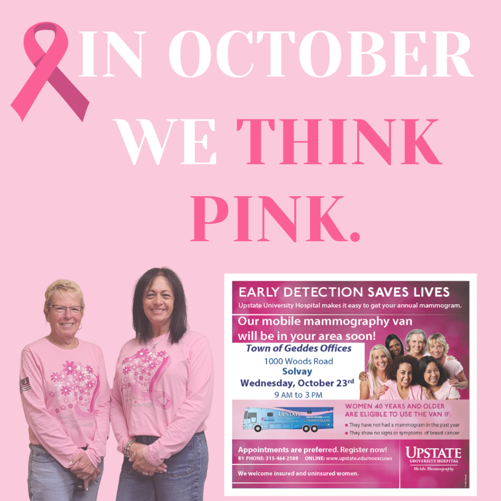 Upstate University Hospital’s Mammography Van will return to The Town of Geddes Offices at 1000 Woods Road in Solvay on Wednesday, October 23, 2024. The screenings will be available between 9 a.m. and 3 p.m.